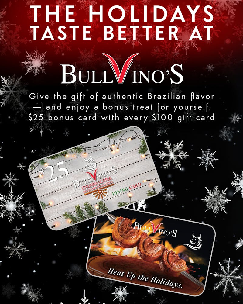 For a limited time only, when you buy $100 in Bullvino’s gift cards, you’ll receive a $25 bonus card to use on a future visit.